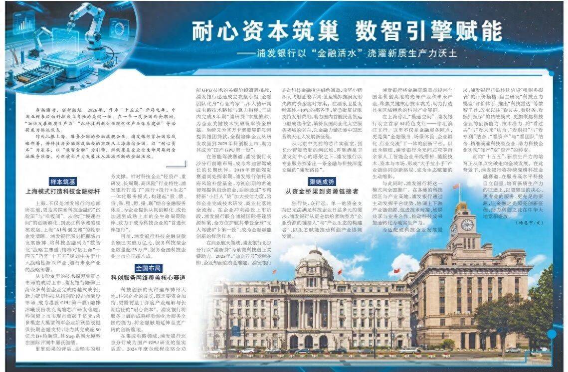 算作扎根上海、劳动世界的金融旗舰企业,浦发银行紧扣国度政策部署,将科技与金融深度长入的实践从上海推向世界,以“耐烦成本”为基石,以“数智金融”为引擎,织就掩盖企业全生命周期的金融劳动网罗,为新质出产力发展注入源远流长的金融流水。
