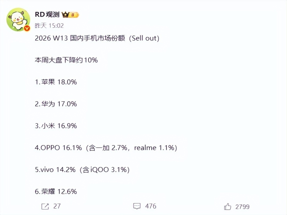 最近,第13周国内手机销量的统计依然出来,比拟于前几期,此次较为平庸,但也有明显变化,咱们来望望。