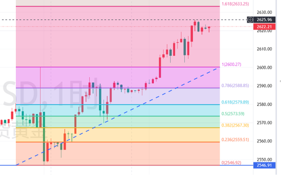 回来盘面上看,小时线级别,金价在冲破2600关隘后第一次回调高点2612,其次2619,这两次的回调位置王人是2602这里,在此变成一个小双底的形态,下周开盘可手脚一个撑持位参考,其次即是上扬前2590隔壁震撼的位置;上方的压制位主要存眷周五分析2632这里,灵验冲破后老秦会再做分析的。