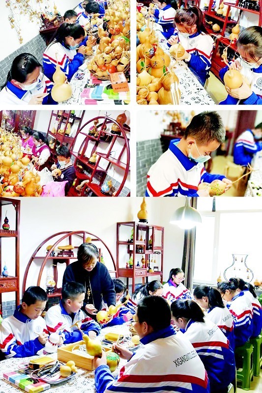 从想象筹划栽种田到创作创意好意思术作品,同学们将水稻、花生种子与画图圆善诱骗创造出立体画,将葫芦进行画图烙刻、与绳编艺术相诱骗制成工艺好意思术作品……学生将当然界的原材料滚动为不仅具有实用价值、而况具有审好意思价值的物品,澄莹体会“就业创造价值”的潜入含义和“就业创造好意思”的真义。